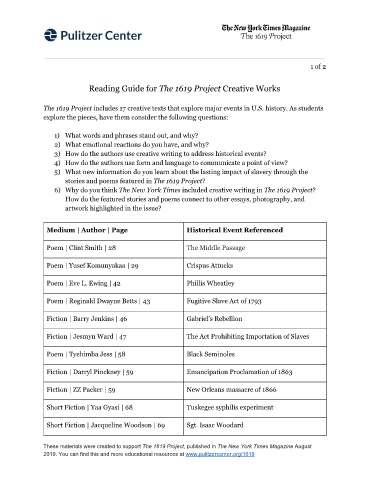 Reading Guide for The 1619 Project Creative Works