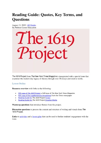 • Reading Guide for The 1619 Project Essays