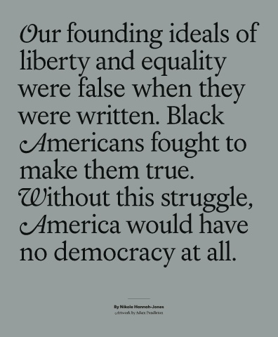 Our founding ideals of liberty and equality were false when they Black were written. Americans fought t o make them true. Without this struggle, have America would no democracy at all. By Nikole Hannah-Jones Artwork by Adam Pendleton