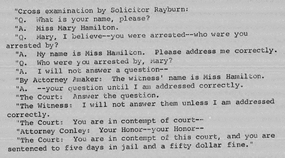 So the judge got mad at this "uppity" Black woman and he found her to be in contempt of court, fined her $50, and sentenced her to 5 days in jail. Well, she was not having any of that so she appealed the decision. The Supreme Court of Alabama upheld her contempt charge citing that she had been asked a lawful question and, since she did not invoke a valid legal exemption to support her refusal to answer it, the judge was well within his judicial discretion to charge her with contempt. What is noteworthy in this decision, is that the court felt it important to point out that "[t]he record conclusively shows that petitioner's name is Mary Hamilton, not Miss Mary Hamilton."