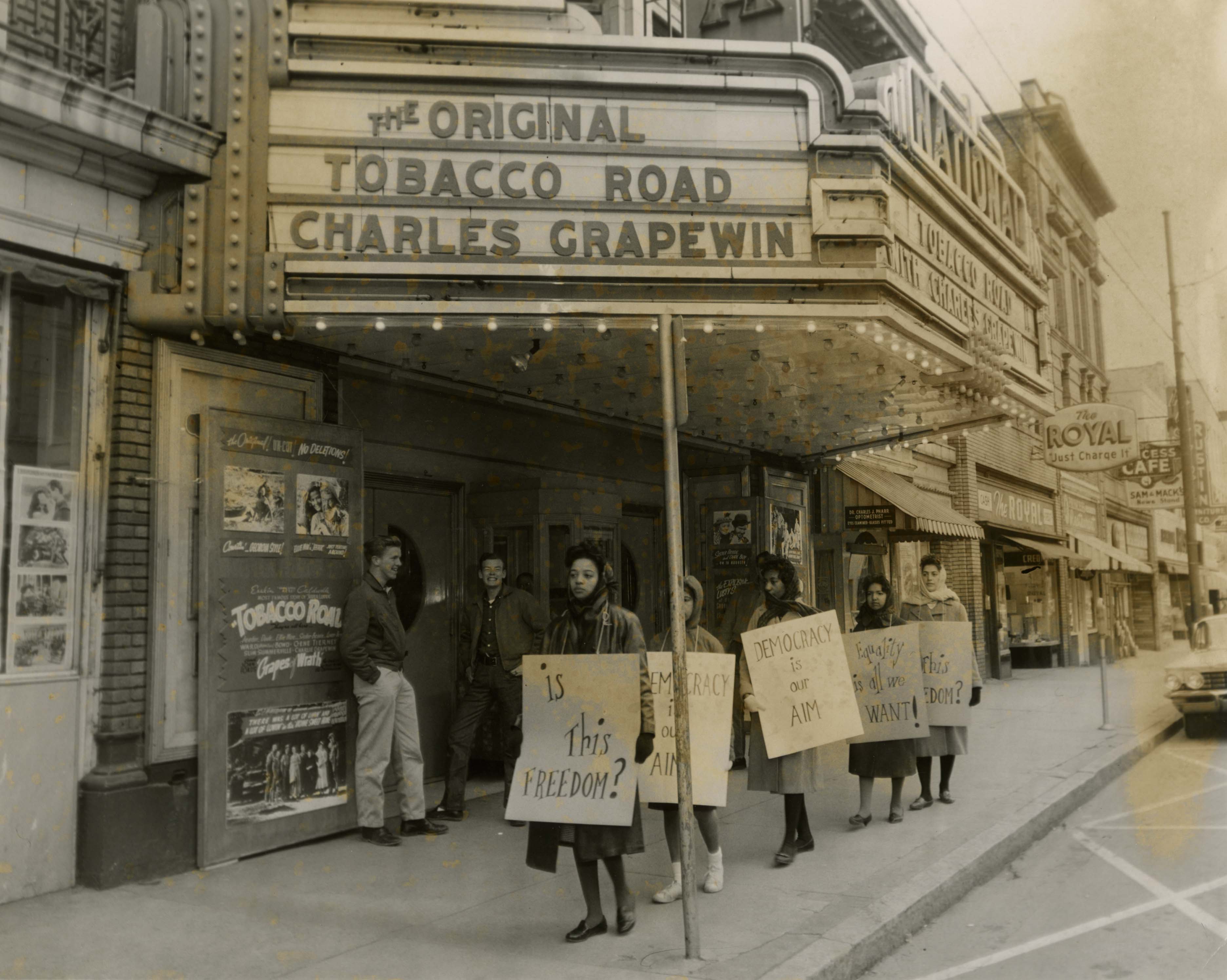 Students from Bennett College are seen here protesting racial segregation at the National Theatre in downtown Greensboro, North Carolina, in the 1960s. The women's HBCU, which played a prominent role in the Civil Rights Movement, is now facing the threat of closure due to financial difficulties, but there's an effort underway to save it. (Photo via Wikipedia.)